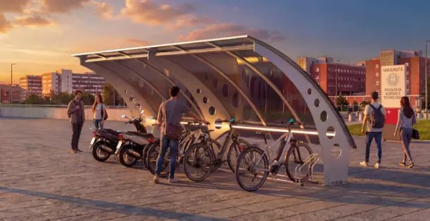 SunSystem, la nuova pensilina con pannelli fotovoltaici di MetalSystem: una pensilina che ripara e, al tempo stesso, fornisce energia alla mobilità urbana sostenibile.
